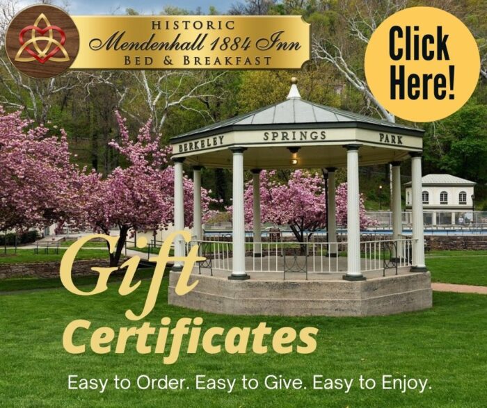 First Lady Claire and Mayor Greg Schene invite you to step back in time and experience the award-winning charm of the Mendenhall 1884 Inn Bed & Breakfast in Berkeley Springs, West Virginia. Nestled in the Historic Town of Bath (Berkeley Springs), America’s First Spa Town, frequented by authors, artists, signers of the Declaration of Independence, and George Washington himself — you too can partake and experience the rejuvenating waters of the mineral springs that made this town famous.